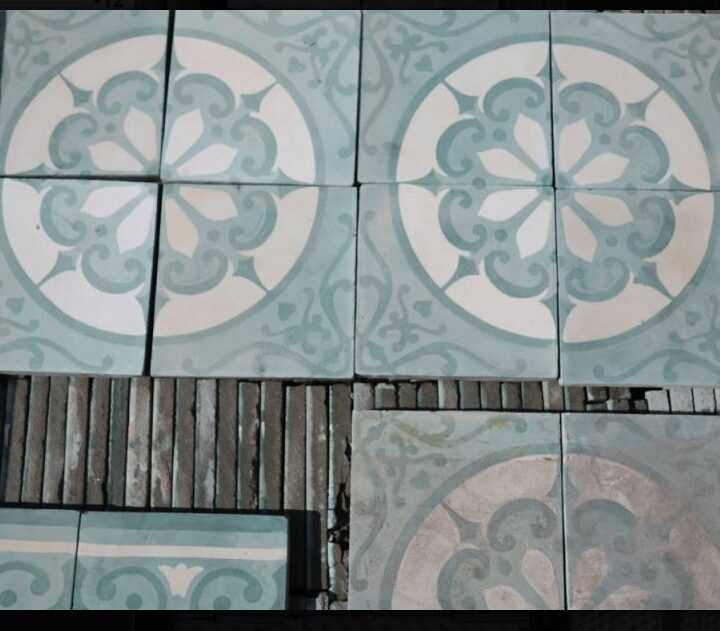 Rare lot de carreaux de ciment anciens au motif emblématique « Fleur Solaire », parfait pour un projet de rénovation haut de gamme ou une décoration d’exception.