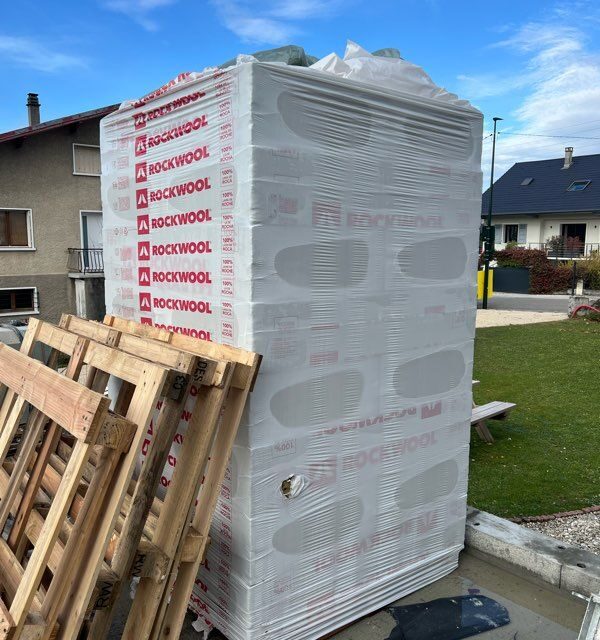 Bonjour, Je vends une palette complète d’isolation extérieure en laine de roche, épaisseur 120mm. La palette a une surface de 25,92m². Finition à enduire. Marque : ROCKWOOL